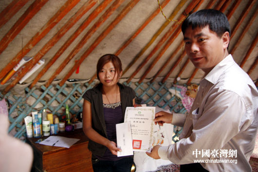 额尼日乐的姐姐格根照拉从顶新公益基金会代表手中接过妹妹的奖学金,心中感慨万端(中国台湾网 芜同 摄)