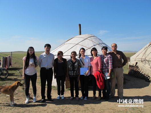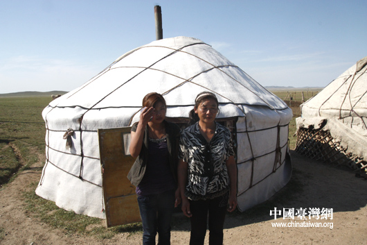 顶新公益基金会工作人员及记者与格根照拉和她的额吉苏布达在蒙古包前合影(中国台湾网 芜同 摄)