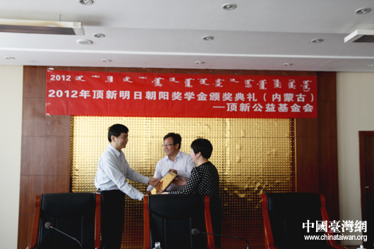 克什克腾旗党委常委尚文和旗政协副主席宝希强向顶新集团代表赠送捐资助学奖状(中国台湾网 芜同 摄)