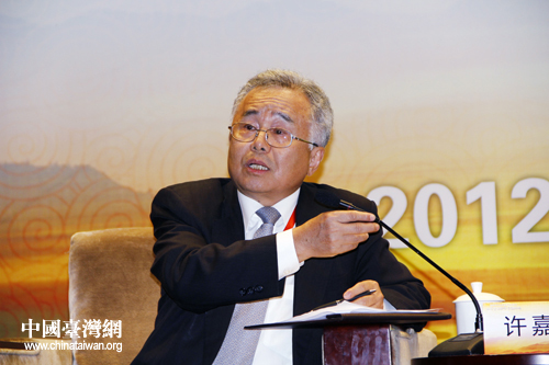 19日下午,“2012海峡两岸企业家紫金山峰会”两岸金融合作专题论坛在南京举行,台湾金融服务业联合总会理事长许嘉栋参与论坛与谈。(中国台湾网 于斯文 摄)
