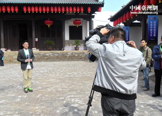 台湾东森电视台特约记者在山西非物质文化博览会上进行采访拍摄。(中国台湾网 郭庆娜 摄)