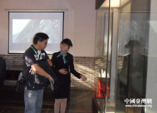 在平遥文涛坊古兵器博物馆,引导员向台湾记者介绍古兵器文化。(中国台湾网 郭庆娜 摄)