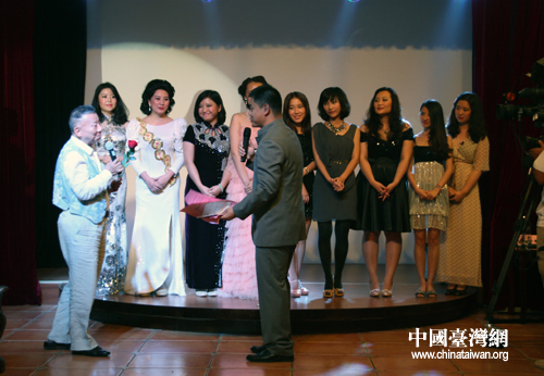 邓丽君的老师、来自台湾的著名音乐制作人左宏元先生为自己心仪的模仿者献上玫瑰。(中国台湾网 王怡然 摄)