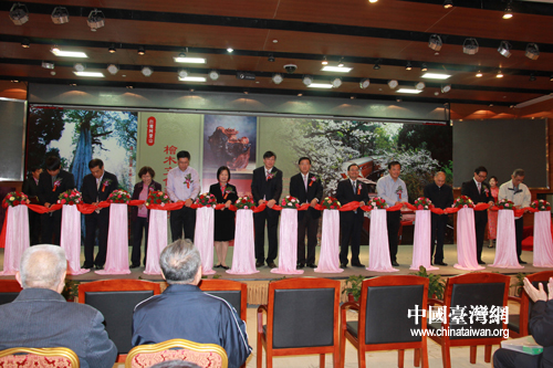 多位嘉宾为“台湾阿里山桧木文化艺品展”剪彩。(中国台湾网 马迪 摄)