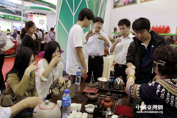 9月28日,由农业部海峡两岸农业交流协会与台湾嘉义市农会合作主办的台湾精品馆亮相第十届中国国际农产品交易会。图为参观者品尝台湾阿里山高山茶。(中国台湾网记者 普燕 摄)