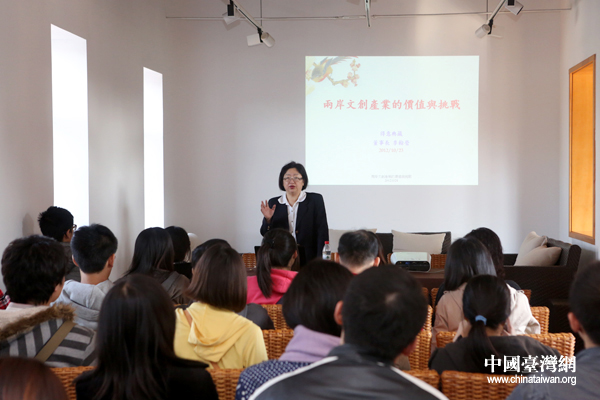 北京得意典藏公司董事长、台商李瀚莹女士为同学们举行了题为《两岸文创企业的价值与挑战》的讲座,以亲身经历为同学们在大陆工作和创业提供了宝贵的经验。(中国台湾网 普燕 摄)