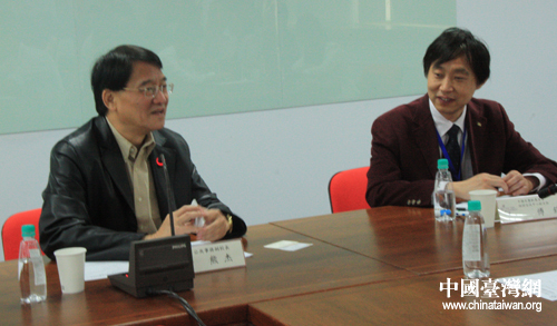 参加交流座谈的世新大学副校长熊杰和大陆青年交流团团长付锋(中国台湾网 王文英 摄)