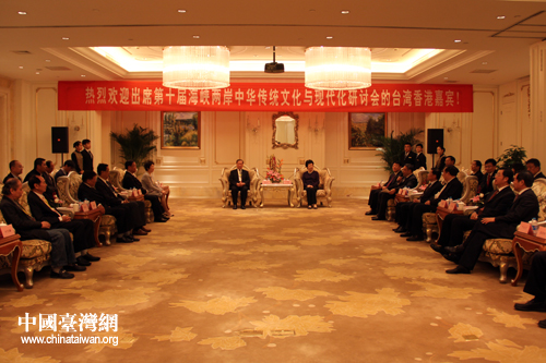 31日晚,全国人大常委会副委员长、民进中央主席严隽琪,在江苏如皋会见了台湾“海峡两岸民意代表交流基金会”董事长饶颖奇等15位出席第十届海峡两岸中华传统文化与现代化研讨会的台湾和香港嘉宾。(中国台湾网 杨丽 摄)