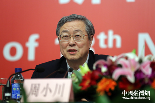 11日晚间,中国人民银行行长、党委书记周小川在十八大新闻中心接受采访时表示,内地遴选两岸货币清算行的程序已经启动,不会耽搁过久。(中国台湾网 王伟 摄)