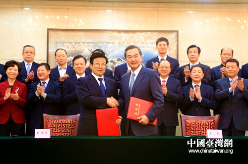 中国台湾网11月12日北京消息  今天下午,国务院台湾事务办公室与贵州省人民政府在京正式签署促进黔台交流合作备忘录。中共中央台办、国务院台办主任王毅,贵州省委书记、省长赵克志等领导出席了签字仪式。(中国台湾网记者 马迪)