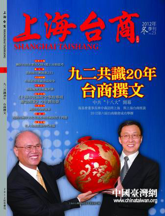 中国台湾网11月14日上海消息 “九二共识”达成二十周年之际,上海台商纷纷在新出版的2012年冬季刊《上海台商》杂志上撰文,表示“九二共识”是两岸经济共创双赢的重要保障,应珍惜“九二共识”的成果,继续深化和发展“九二共识”精神。