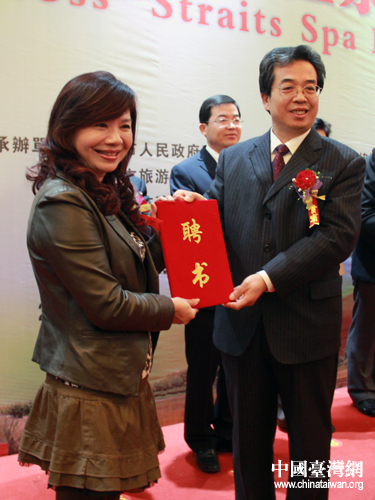商河县温泉生态旅游观光协会会长李方金向两岸同业颁发聘书。(中国台湾网 杨丽 摄)