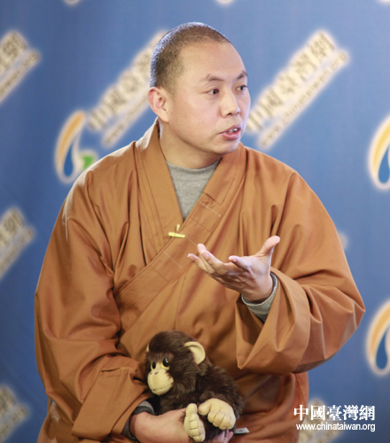 延参法师携其新书做客中国台湾网,法师向网友详细介绍了他的慈善理念。(中国台湾网 王伟 摄)