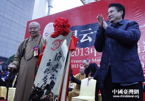 海南省委书记、省人大常委会主任罗保铭,台湾佛光山开山宗长星云大师为海峡两岸(海南)文化交流联合会和一笔字书法展揭牌(中国台湾网 马萌摄)