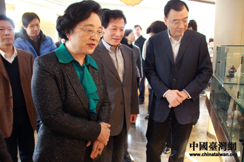 全国政协副主席、台盟中央主席林文漪等参观欣赏天福茶文化馆内的精美茶具。(中国台湾网 王怡然 摄)