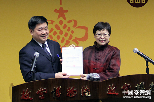 两岸故宫博物院院长22日在北京故宫探讨合作,在随后举行的2013年两岸故宫交流记者会上,台北故宫博物院院长冯明珠(右)递给北京故宫博物院院长单霁翔(左)一封邀请函,邀其年内访台。(中国台湾网 杨丽 摄)