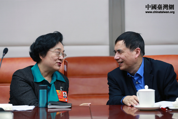 全国政协副主席、台盟中央主席林文漪在讨论会上与台籍委员杨健交流看法。(中国台湾网 于斯文 摄)