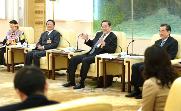 3月7日,中共中央政治局常委、全国政协十二届一次会议主席团会议主持人俞正声参加十二届全国人大一次会议台湾代表团的审议。 新华社记者马占成 摄