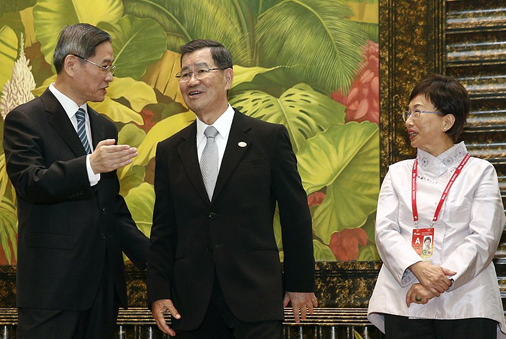 4月7日,国台办招待酒会在海南博鳌举行,图为国务院台办主任张志军(左)欢迎台湾两岸共同市场基金会荣誉董事长萧万长夫妇参加酒会。中新社发 张浩 摄