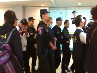 朱姓和胡姓男子在警方人员重重戒护,两人分别铐上手铐,其中一人还上脚镣,以防万一。两人戴着口罩,用双手捂着脸,在机场一路上低头不语。台“刑事局”随后将两人押上车,离开桃园机场。(中国台湾网 周剑)