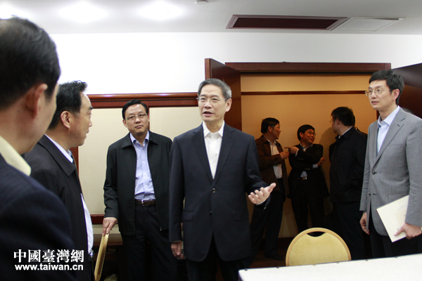 5月16日,中共中央台办、国务院台办主任张志军到两岸企业家峰会秘书处看望工作人员。(中国台湾网 杨丽 摄)
