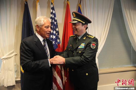 华盛顿时间8月19日,正在美国进行正式友好访问的中国国务委员兼国防部长常万全(右)与美国国防部长哈格尔在华盛顿五角大楼举行会谈前相谈甚欢。中新社发 吴庆才 摄