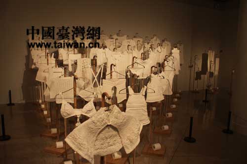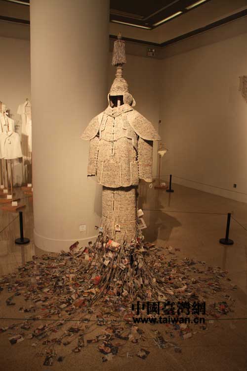 “交互视象——2013海峡两岸当代艺术展”在中国美术馆亮相,大陆艺术家的作品“战利品”是用手纸和报纸制作的(中国台湾网 芜同 摄)