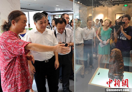 图为出席该图片展开幕式的金门陶艺家王明宗(左)携风狮爷首秀福州。作为闽台共同的民间信仰,风狮爷是金门的守护神,距今最久远有320年历史,目前岛上共有72尊,各异其趣,是金门非常珍贵文化资产。刘可耕 摄