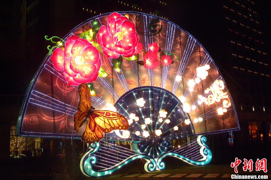 荟萃两岸传统文化的首届海峡两岸(昆山)中秋灯会9月14日晚首度试灯,当晚60多组大型灯组、30万平方米七大主题灯区美轮美奂。一组组流光溢彩的花灯呈现着两岸相近的中秋民俗传统、文化风貌以及风格各异的江南水乡元素、台湾妈祖文化等特色文化,两岸民众喜闻乐见的花卉、寓意吉祥的文化元素交相辉映。图为灯组国色天香,以“花中之王”牡丹为主题,慢慢绽放,扇面采用现代光雕材质,构成花开富贵的吉祥图案。黄莹 摄