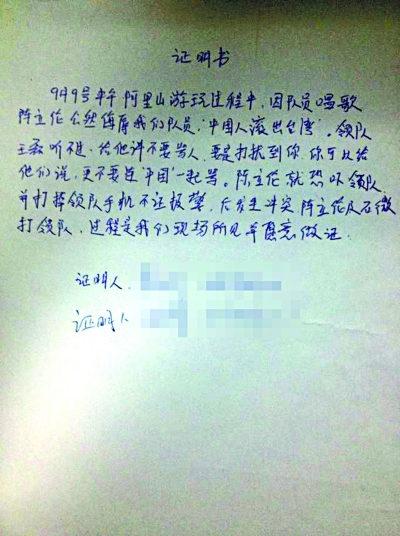 为了确证自己所言无误,王磊向北青报记者提供了一份由团里两名游客书写的证明书,并准备作为以后打官司的证据。该文肯定了因唱歌遭到台北男子辱骂后,王磊前去和解,但遭继续挑衅并被打掉手机而发生冲突的事实,“过程是我们现场所见并愿意作证”。王磊向北青报记者提出保护证明人信息的申请,北青报记者隐去了两位游客的姓名及电话。