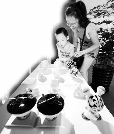 今年8月,两岸青年文创精品展在福州开幕。图为“台湾新设计”展区内的台湾创意瓷器吸引了一对母子的眼球。 刘可耕摄(中新社发)