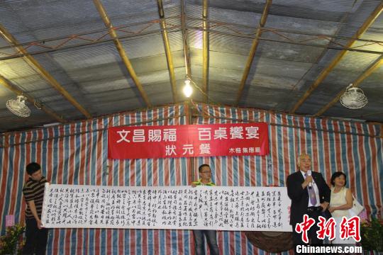 图为许文彬律师(第二排右2)与荣登榜首学子出席台北市文山区木栅集应庙“文昌赐福,百桌飨宴”活动。 冽玮 摄