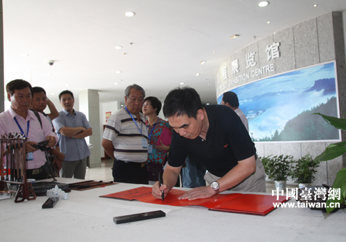 湖北省台办宣传处处长伍洋在三峡工程展览馆留下笔迹。(中国台湾网 段雯婷 摄)