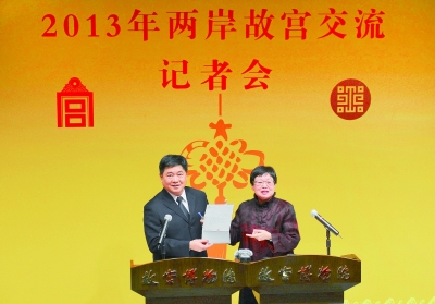 1月22日,台北故宫博物院院长冯明珠(右)向北京故宫博物院院长单霁翔递交邀请函,邀请其赴台北故宫访问。新华社记者金良快摄