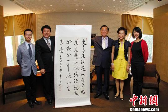 覃志刚向中国国民党荣誉主席连战赠送书法艺术作品。 宝胜 摄