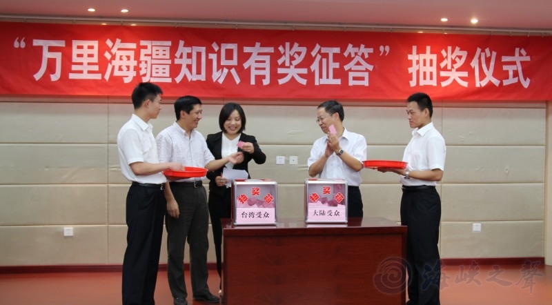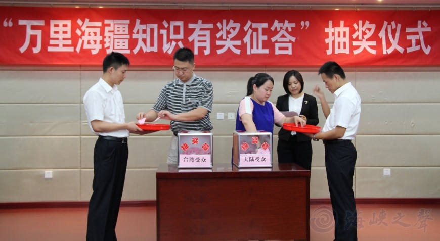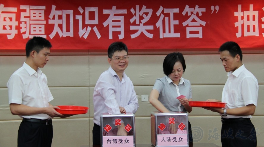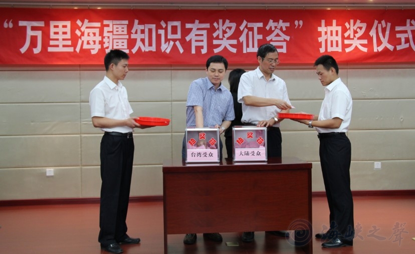 为进一步扩大《万里海疆巡礼》活动效果,强化海洋强国观念及两岸受众对海洋国土的了解,海峡之声广播电台、福建省海洋与渔业厅联合承办“万里海疆知识竞答”活动,获得两岸民众的热情响应,经过近两个月的答案征集,至10月10日截止日,有8779位两岸民众(其中台湾民众4083人)踊跃参与本次活动。本着公平、公正、公开原则,在现场公证人员、各协办单位人员和社会各界代表的监督之下,本次征答活动抽奖仪式于10月19日15时30分在福州举行,来自两岸一百三十名参与者分别获得一、二、三等奖和鼓励奖。(详细名单附后)