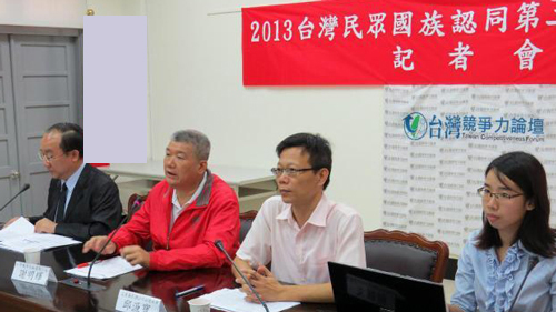 台湾竞争力论坛理事长、台湾大学政治系副教授彭锦鹏、论坛执行长谢明辉、艾普罗民调公司副总邱源宝、专案经理赖韵文上午在“立法院”请愿接待室召开记者会,公布第三季国族认同调查结果。