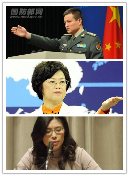 从上至下:国防部发言人杨宇军、国台办发言人范丽青、台湾行政主管部门发言人郑丽文。(合成图)