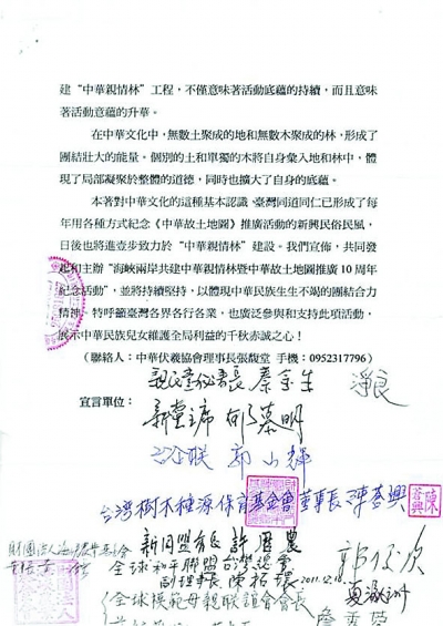 《中华故土亲情林 华夏纽带千秋心宣言》即第一份宣言的部分署名手迹