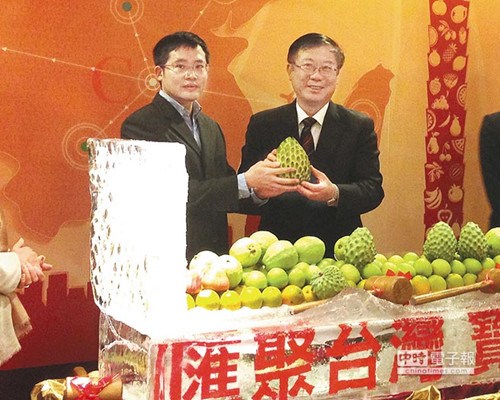 阿里巴巴旗下“聚划算”总裁张建锋(左)与台湾农委会主委陈保基(右)出席“汇聚台湾之台湾水果创新C2B模式启动会”。来源:台湾《旺报》