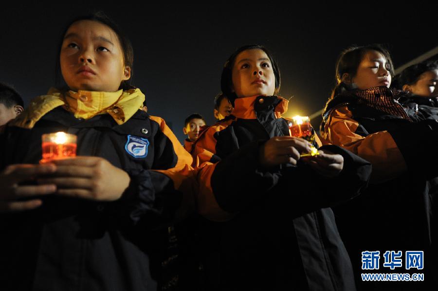 12月12日,南京江东门小学的学生手捧红烛祭奠南京大屠杀遇难者。当晚,侵华日军南京大屠杀遇难同胞纪念馆举行“为南京大屠杀遇难者守灵仪式暨和平烛光祭”活动。南京市民和学生代表、中日韩三国僧侣及来自韩国、日本等国的国际友好人士在侵华日军南京大屠杀遇难同胞纪念馆祭场点燃3000支红烛,为南京大屠杀遇难者守灵并祈祷世界和平。今年12月13日是南京大屠杀遇难同胞遇难76周年纪念日。新华社记者 韩瑜庆 摄
