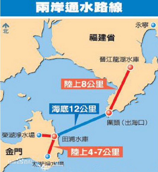 这条备受瞩目的供水路线,水源来自容量6.55亿立方米的晋江山美水库,目前水道已打通到海边围头,一旦16.7公里海上管线铺设完成,即可登陆金门金沙镇田埔海边,再铺300米陆上管线,就能直达田埔水库,分流输送周边净水场处理。