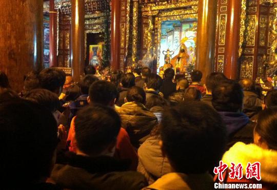 年糕﹑发糕﹑红龟糕……供桌上摆满的台湾传统年节美食,勾起了老台商郭先生儿时参加妈祖庙会的美好回忆,“我专程从上海赶过来,上香谢天公、点龙凤呈祥灯、烧头香、两将出巡,台湾的古典宫庙礼制又重现了。”