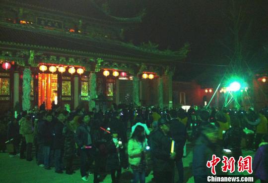 只见台胞们手捧光明灯连成“龙图大展”﹑“有凤来仪”两列长龙,跟随着德高望重的长者走过象征着福禄寿的金水桥,祈礼二十四节气,祈求风调雨顺、天下太平。别开生面的传统古礼,吸引了不少前来烧头香的市民,大家依葫芦画瓢地学样沾福气。