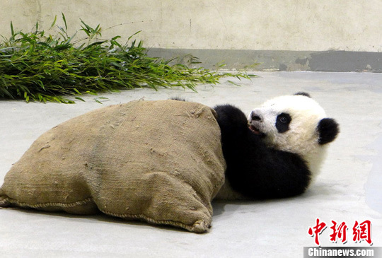 资料图:“圆仔”在玩“新玩具”抱枕。台北市立动物园 供图
