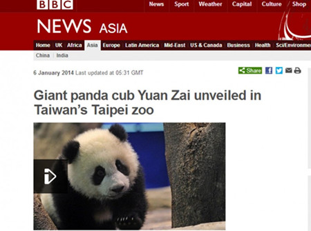 1月6日,大陆赠台大猫熊“团团”、“圆圆”所生宝宝“圆仔”首次亮相,国际媒体争相报道。图为英国媒体BBC网站的报道。(图片来自台媒)