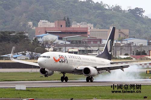 山航济南-花莲直航班机在台湾花莲机场降落。(图片来源:山东省台办)