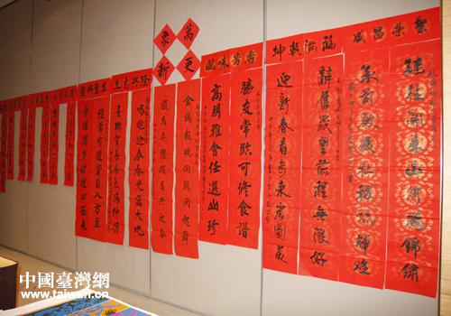 活动展出的两岸书法家书写的春联。(中国台湾网 郭庆娜 摄)