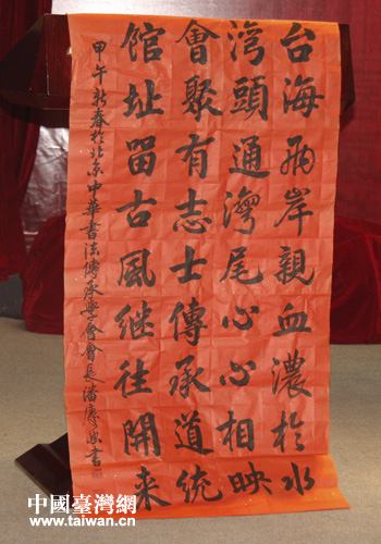 台湾书画家潘庆忠为台湾会馆创作书写的藏头诗。(中国台湾网 郭庆娜 摄)