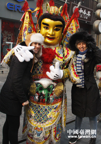 活动中,外国游客兴奋的与电音三太子合影。(中国台湾网 郭庆娜 摄)